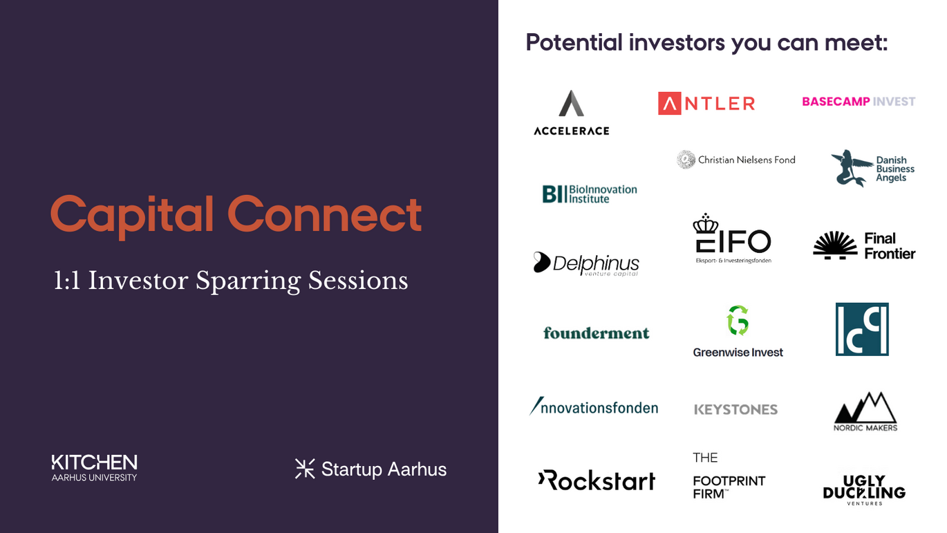At the event, you can potentially meet Accelerace, Antler, Basecamp Invest, BioInnovation Institute, Christian Nielsens Fond, Danish Business Angels, Delphinus Venture Capital, EIFO Eksport- & Investeringsfonden, EP Capital, Final Frontier, Founderment, Fusion Capital, Greenwise Invest, ICP, Innovationsfonden, Keystones, Noon Ventures, Nordic Makers, People Ventures, PreSeed Ventures, Rockstart, The Footprint Firm, Ugly Duckling Ventures, Startup Aarhus and Kitchen, Aarhus University.