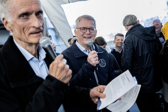 Den erfarne politiker indledte selv sangen akkompagneret af AU-rektor Brian Bech Nielsen, mens resten af de fremmødte stemte i: